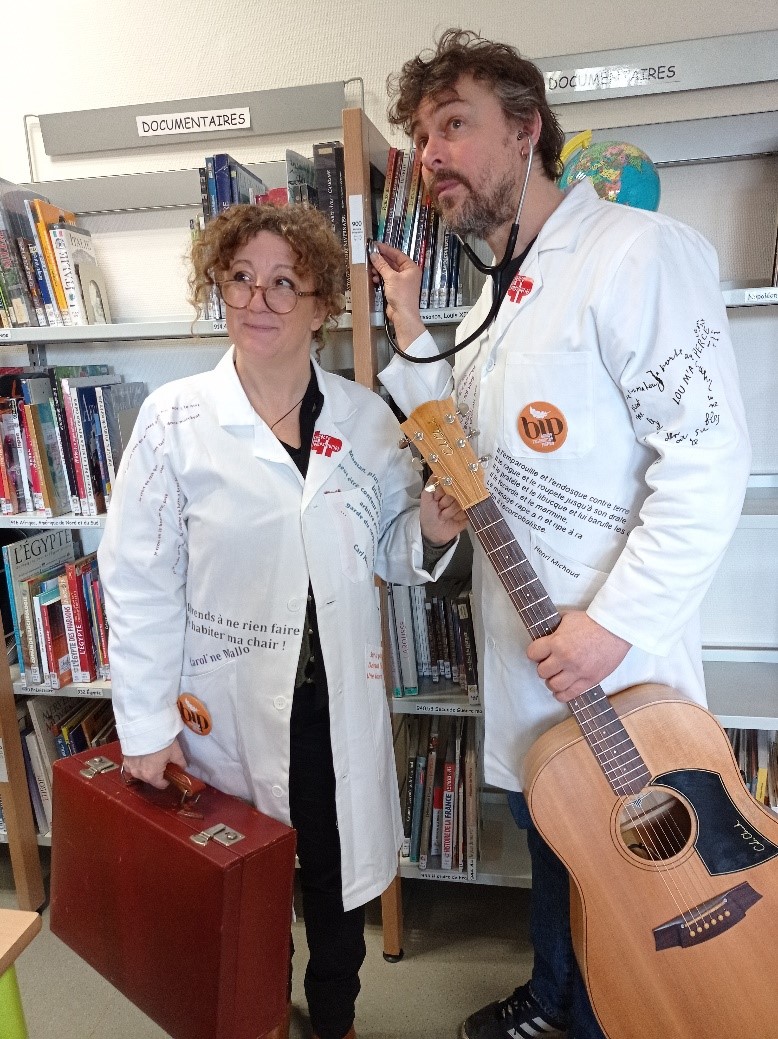 Nos Poésitologues, Marie-Julie de Coligny, en alternance avec Marie-Christine Dumont, et Sébastien Gauthier iront à la rencontre des élèves de primaire et du collège pour faire pratiquer un soin poétique et lutter contre les carences en poésie. Outillés de leurs instruments, guitare, poids plumes, et poésies en tout genre, ils prescriront et diffuseront dans les écoles une bonne cure de Vitamine P. Ils construiront, par un imaginaire burlesque et ludique, un cadre permettant aux enfants d’écrire, de lire et de partager ensemble un moment de poésie sur le thème "Liberté. Force vive, déployée".