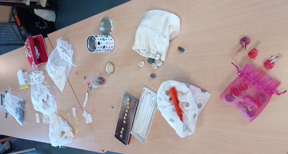 Les élèves ont été conviés par Pauline Sauveur à un savoureux « buffet de mots » (des mots-cailloux, des mots doudous, des mots plumes, des petits maux, des micros-mots) pour créer des phrases poétiques.