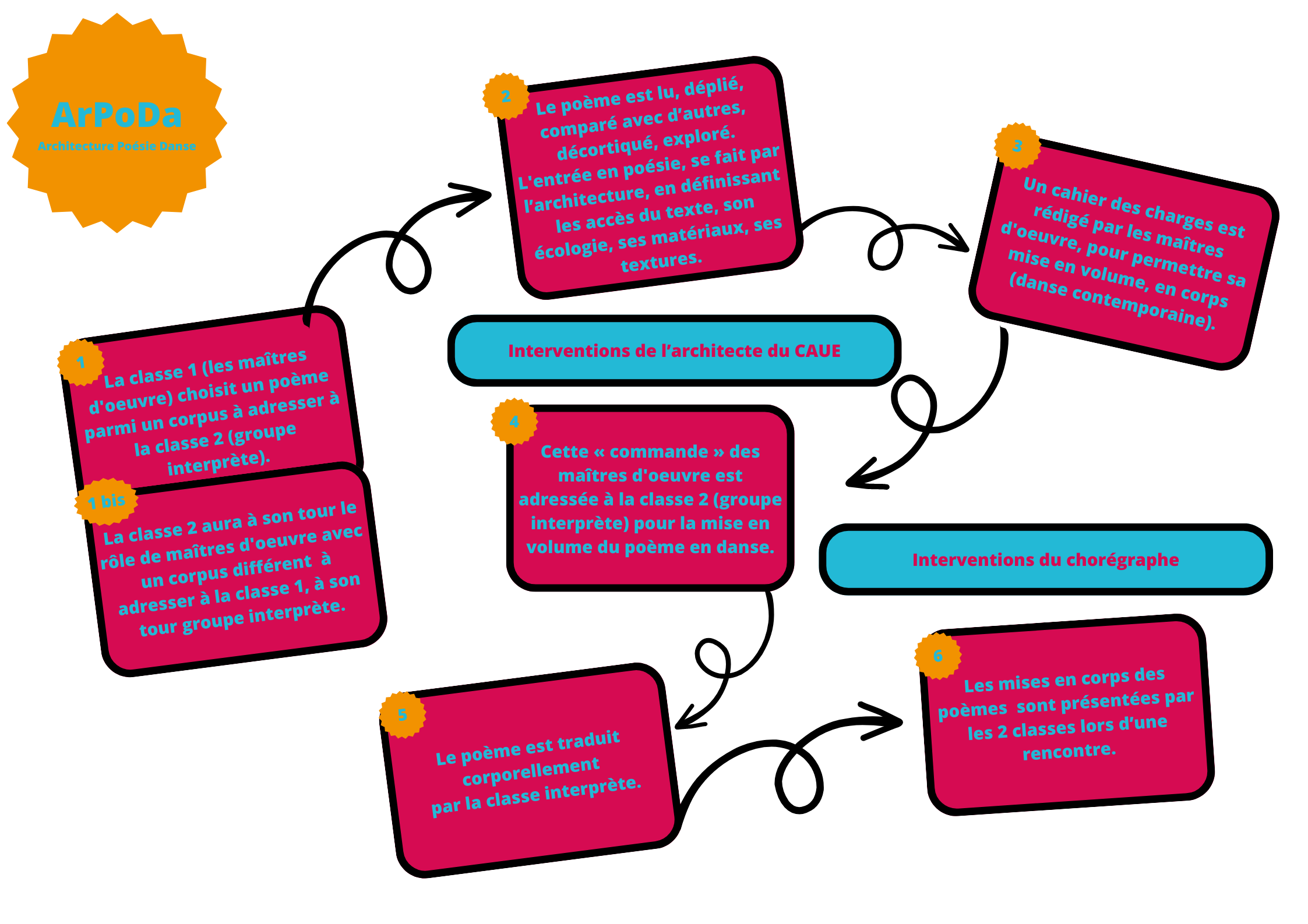 Ce projet oeuvre pour le développement de l’éducation artistique à l’école. Il favorise la rencontre des enfants et adolescents avec la poésie, l’architecture et la danse. Les pratiques proposées prendront appui sur la philosophie de la coopération à l’école, et s’inscrivent dans des projets de classe, le partenariat enseignant-artiste est une donnée nécessaire et essentielle, au coeur du projet ArPoDa.