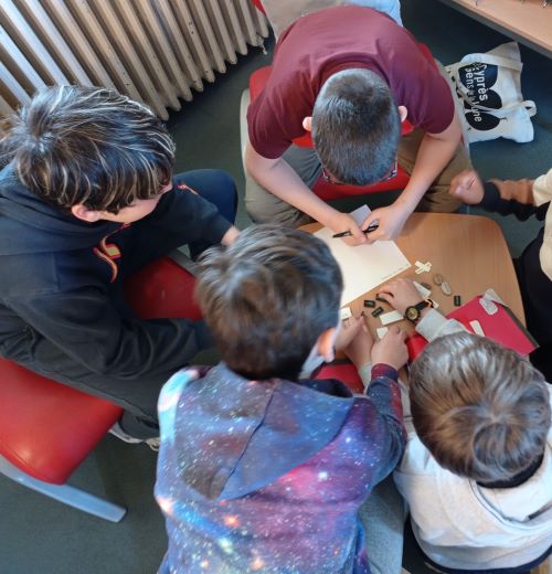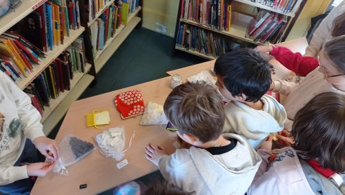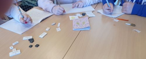 Les élèves ont été conviés par Pauline Sauveur à un savoureux « buffet de mots » (des mots-cailloux, des mots doudous, des mots plumes, des petits maux, des micros-mots) pour créer des phrases poétiques.