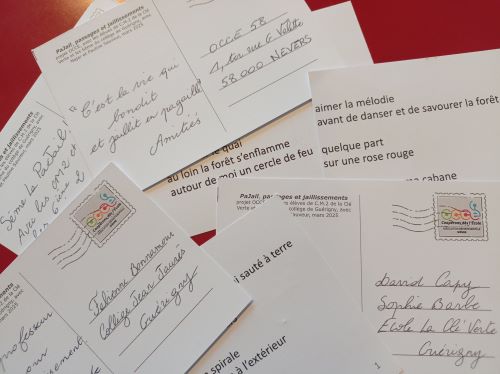 Puis, la poésie a déferlé salle Lafayette à Guérigny lors d’une restitution du travail devant un public attentif d'élèves de l'école et du collège : une mise en espace des phrases écrites, mêlées à une lecture musicale des deux artistes, et qui s’est clôturée par «le rond d’Argenton » dansé et chanté. Puis le public a été invité à participer à cette danse collective ; le refrain « C'est la vie qui jaillit et qui bondit en pagaille » s’est ainsi complétement déployé dans cette effervescence partagée.